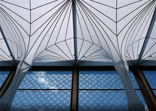 ETFE薄膜允許紫外線透射,可保證樹木健康生長(zhǎng),而在ETFE薄膜上印銀點(diǎn)就能為用餐者提供一定程度的陰影,最后結(jié)構(gòu)頂部的通風(fēng)口可以讓暖空氣逸出,樹木和用餐者都會(huì)很舒適。該餐廳膜結(jié)構(gòu)形狀和跨度圍繞樹冠設(shè)計(jì),ETFE材料的運(yùn)用實(shí)現(xiàn)了人與自然的和諧相處。