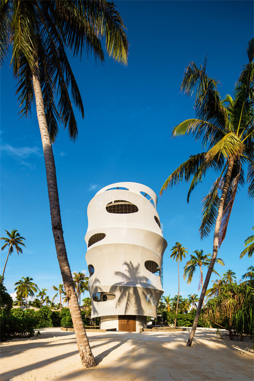 該獨(dú)特建筑位于馬爾代夫島,于2014年建成,和島上其他傳統(tǒng)建筑設(shè)計(jì)風(fēng)格不同,該建筑采用了白色鏤空的膜結(jié)構(gòu)立面,使得建筑超前、現(xiàn)代。
