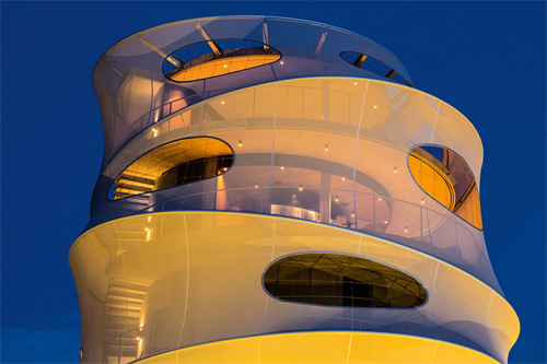 這座高23米造型獨(dú)特的餐廳足以吸引全島的目光。建筑使用鋼筋混凝土作為主要材料,金屬網(wǎng)和膜結(jié)構(gòu)作為建筑立面,垂直的桶狀構(gòu)造既是它的支撐結(jié)構(gòu)也是建筑的主體,外圍使用預(yù)制樓板制成的主樓梯盤旋而上。