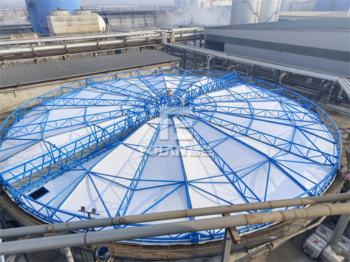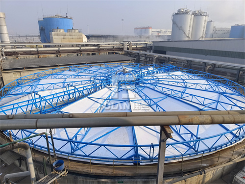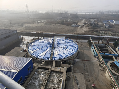 竣工后的污水池,呈扁平圓錐形,結(jié)構(gòu)輕盈。白色的膜材,藍色的鋼構(gòu),大跨度空間膜結(jié)構(gòu)污水池加蓋,既美觀大氣,又能幫助凈化廢氣保護環(huán)境。