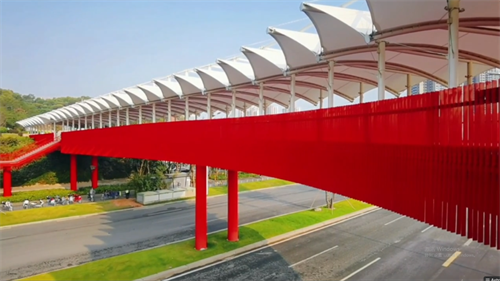 若你們想去深圳旅游,一定要去深圳最美“紅飄帶”——光明虹橋公園。其中“虹橋”全長(zhǎng)4公里,是全國(guó)第二大鋼結(jié)構(gòu)單柱多曲景觀橋。入口處,設(shè)有一段造型獨(dú)特的白色PTFE膜結(jié)構(gòu),飄逸又壯美!
