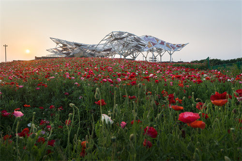 若你們想去江蘇,一定要去宿遷三臺(tái)山公園看看,一座大型景觀建筑劇場(chǎng)矗立于花海之間。劇場(chǎng)能容納3000座室外觀眾席,有可遮蔽的屋頂覆蓋。屋面三層張拉膜,中間透明膜遮雨,上下兩層彩色膜遮陽(yáng)。彩色膜有粉,黃,紫三種顏色,與花田相呼應(yīng)。