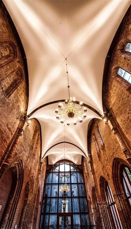 除了外部及屋頂,教堂內(nèi)部吊頂也會運(yùn)用膜結(jié)構(gòu)。膜材吊頂,既能吸音,又能起到裝飾作用,營造出舒適、溫馨、神圣的空間環(huán)境。