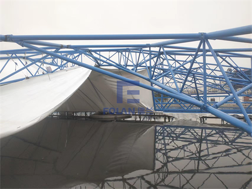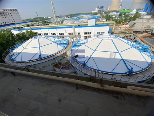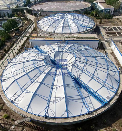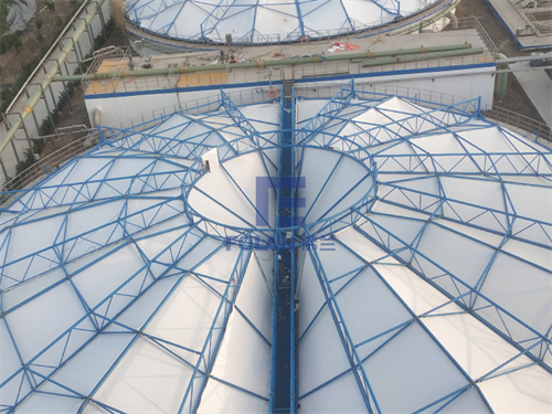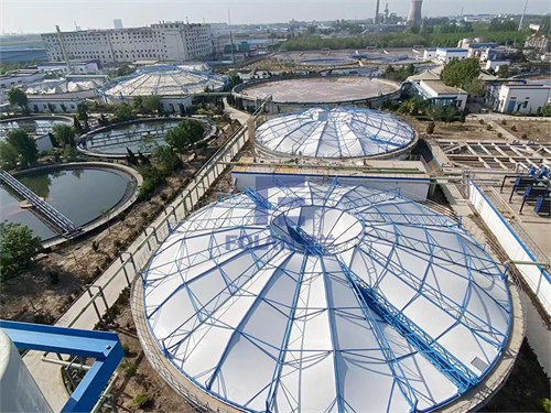 山東的4個(gè)污水池,采用鋼架式反吊膜加蓋方式,選用進(jìn)口雙面PVDF抗酸堿、抗腐蝕膜材,以全新的技術(shù)實(shí)現(xiàn)鋼構(gòu)反吊安裝。