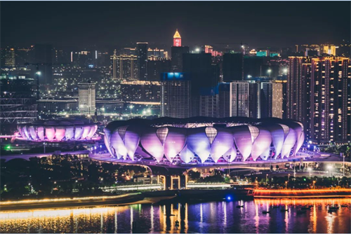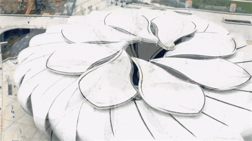 杭州奧體中心體育場屋頂由28片花瓣和27片小花瓣構(gòu)成,遠(yuǎn)看好似一朵綻放在錢塘江畔的“蓮花”,十分動感飄逸。