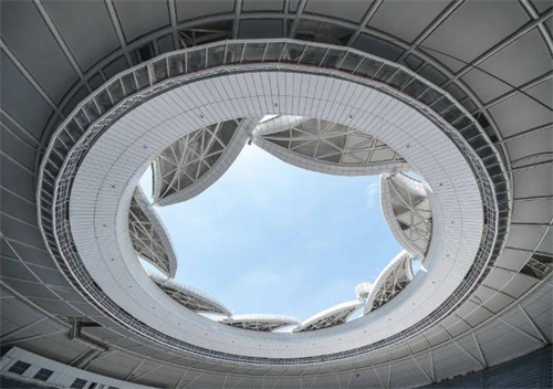棒(壘)球體育文化中心設(shè)計中引人注目的則是球場上的云翼頂棚,既起到遮陽擋雨的作用,又展現(xiàn)出江南水鄉(xiāng)的地域特色。頂棚由雙向桁架系統(tǒng)支撐,覆蓋著涂有二氧化鈦的聚四氟乙烯(PTFE)薄膜,總面積達(dá)到2萬多平方米。表面呈現(xiàn)出微風(fēng)拂過水面泛起的漣漪效果,而在夜晚,LED燈光的照射下,天花板明亮通透,給觀眾帶來了一種獨(dú)特而舒適的觀賽體驗(yàn)。