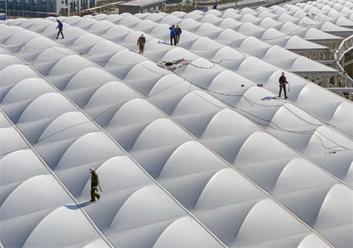 拱墅運(yùn)河體育公園體育場建筑結(jié)構(gòu)采用三角管桁架結(jié)構(gòu)體系,“傘架”由鋼結(jié)構(gòu)構(gòu)成,“傘面邊緣”是一條80米的大鋼管,“傘面”的屋面膜選用PTFE膜,有輕便、高透光、自潔、獨(dú)特的光學(xué)性能等優(yōu)點(diǎn)。