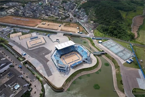 寧波半邊山沙灘排球中心為亞運(yùn)會沙灘排球比賽場地及訓(xùn)練場地,位于寧波市象山縣半邊山景區(qū)內(nèi),占地面積約6.4萬方,含比賽場地2片,熱身場地2片,訓(xùn)練場地3片,大約可容納3000名觀眾觀賽,觀賽區(qū)有一處顯眼的白色膜結(jié)構(gòu)看臺。