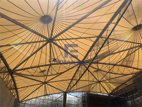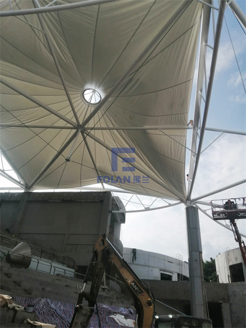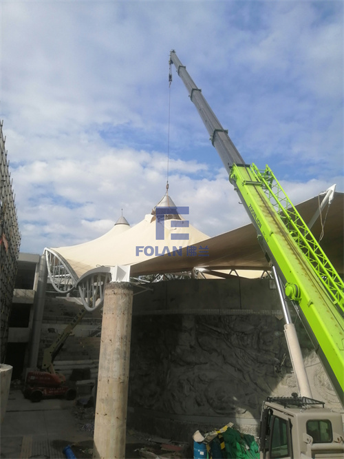 該項(xiàng)目造型獨(dú)特輕盈,由6個(gè)帽子和1段弧拱索邊拼接而成,在新膜的安裝過程中,施工人員先將裁剪好的帽型膜材進(jìn)行吊裝與安裝,然后再吊裝不銹鋼鋼帽,最后是帽子旁邊一段索邊弧拱膜材的吊裝與安裝。