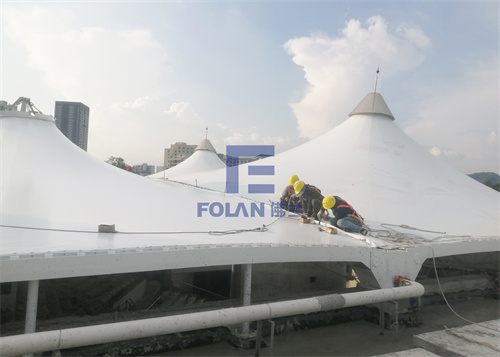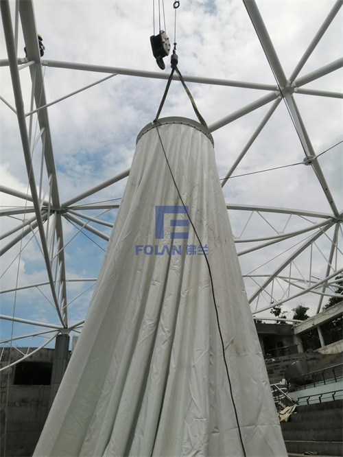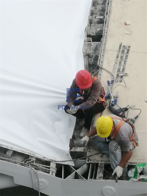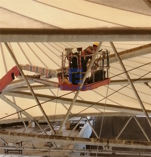 當(dāng)佛蘭空間項(xiàng)目施工人員將所有舊膜和零星固定桿件都已拆除,就要進(jìn)行新膜的吊裝、安裝及固定等施工步驟。該項(xiàng)目新膜材選用的是進(jìn)口法拉利1202S2高自潔PVDF膜,防霉防腐性能好,能長(zhǎng)久保持其表面潔白美觀。