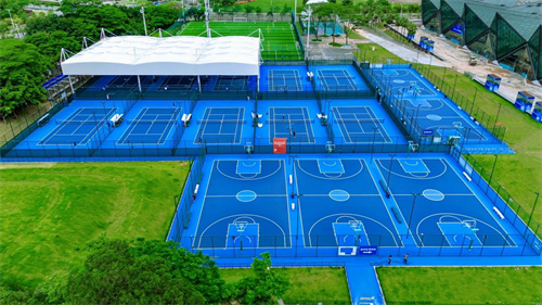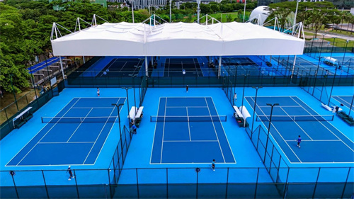 6月,佛蘭空間在深圳大運中心新竣工了一座膜結(jié)構(gòu)網(wǎng)球場,該膜結(jié)構(gòu)可覆蓋三片網(wǎng)球場地,投影面積達2500㎡,采用PVDF膜材,高穹頂設(shè)計與流線,四周增加立面膜材,可防西曬和掃雨,給網(wǎng)球愛好者擁有風(fēng)雨無阻的打球體驗。