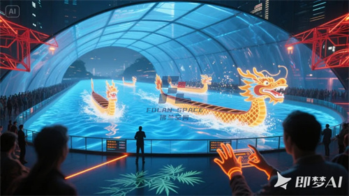2、商業(yè)互動(dòng):商場中庭“AR賽龍舟”,投影膜化身虛擬河道,觀眾手勢操控競渡游戲。