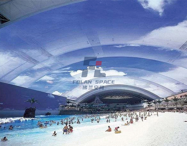 通過大型的造波設(shè)備和大規(guī)模的膜結(jié)構(gòu)屋頂創(chuàng)造出超過天然景觀的人造景觀。海洋穹頂是世界上大的室內(nèi)水上樂園項目之一。