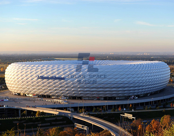 建筑總體呈方圓形,酷似巨型“皮筏”。為ETFE充氣膜結構建筑,整個外立面和屋面由2874個菱形ETFE氣枕覆蓋,總覆蓋面約為56000㎡。