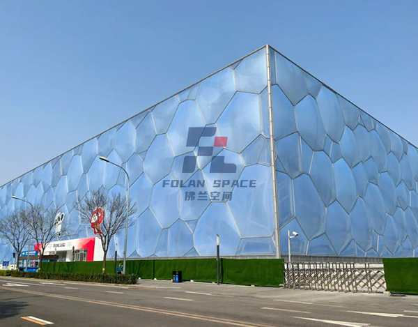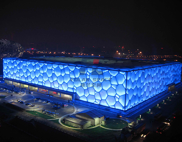 世界上最大的ETFE充氣膜結(jié)構(gòu)建筑,主體鋼構(gòu)采用兩種規(guī)格的多面體(14面體和12面體)組合成的多空間多面體陣列實(shí)體。建筑屋面和墻體有3615個(gè)氣枕覆蓋,大跨度10.75m,大氣枕面積約70㎡,小面積則不足0.5㎡。