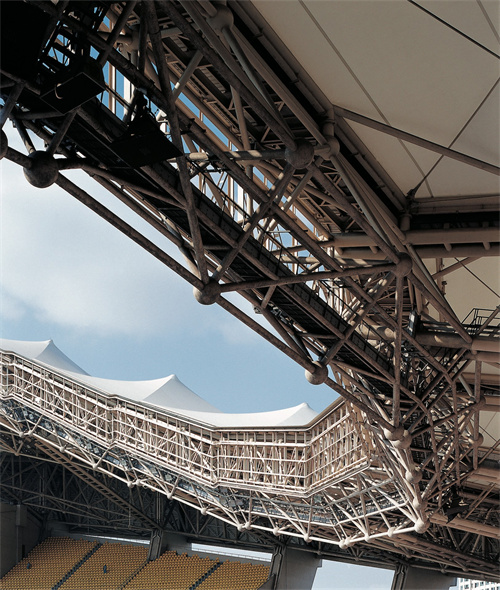 1997年在上海八萬人體育場舉行第七屆全國運動會,觀眾席上方采用馬鞍形大懸挑鋼管空間屋蓋結(jié)構(gòu),覆以乳白色PTFE薄膜材料,面積為3.6萬平方米,這是中國第一次將膜結(jié)構(gòu)用在大面積的永久性建筑上。