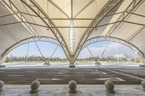 航站樓折型拉膜屋頂向前延伸所形成的建筑入口灰空間,灰空間上方——每組折型拉膜屋頂之間用馬鞍弧形的拉膜空間覆蓋,于航站樓主立面形成波浪起伏的造型。
