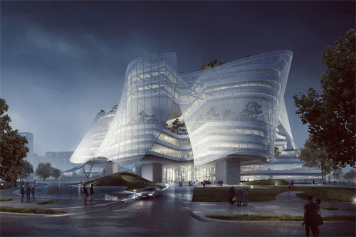 “欣賀設(shè)計中心”的設(shè)計以一個圓形中庭為軸心,六個大跨度空間發(fā)散型星狀布局,形成充滿力量感的骨架結(jié)構(gòu),其間辦公空間和綠色花園混合布置。是一棟內(nèi)部具有理性邏輯的結(jié)構(gòu),看上去有隨風(fēng)飄動的感覺。