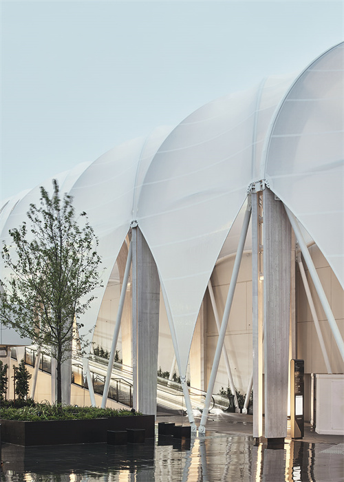 在立體花園的外側(cè)懸掛著半透明的透光率40%的PTFE網(wǎng)格膜材,在炎熱季節(jié)起到遮陽和通風(fēng)作用的同時,也讓建筑看起來飄逸,輕盈,好像一層透薄柔軟的皮膚覆蓋在建筑骨架之上。