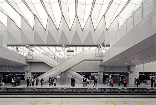 由于PTFE膜材料的半透光特性,白天的車站內(nèi)可以透射進(jìn)柔和而充分的自然光線,無須人工照明;到了夜晚,車站內(nèi)的燈光透射出去,使得車站就像兩條發(fā)光的紙燈籠,乘坐地鐵回家的人遠(yuǎn)遠(yuǎn)就可以看到。