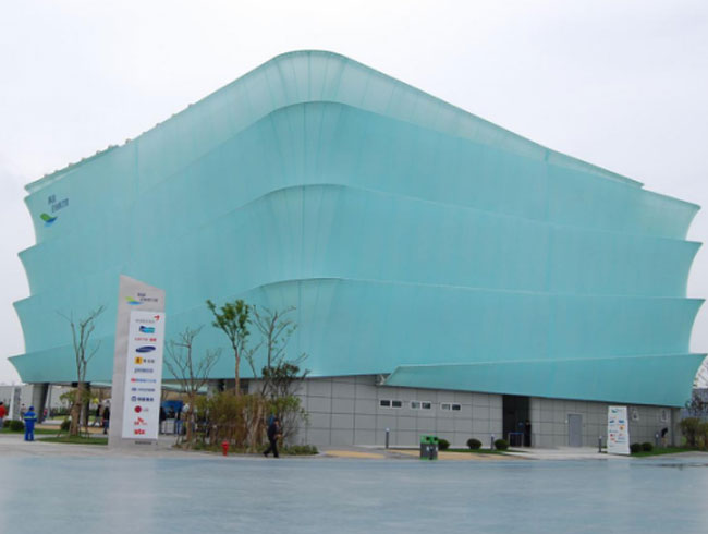 以我們都很熟悉的上海世博會幾個場館為例,展廳主體采用舊廠房或廢棄集裝箱改造,外觀則通過鋼架包裹膜結(jié)構(gòu)完成整體施工,既節(jié)約了工期,又一改廢舊廠房古板、沉悶的外觀造型。如下圖,就是幾個世博園里的展館: