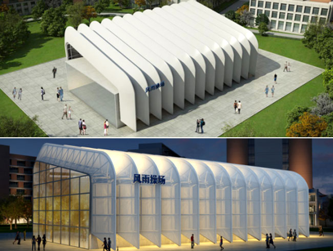由上可見,膜結(jié)構(gòu)可通過鋼結(jié)構(gòu)框架對呆板方正的建筑外觀進(jìn)行改變,用最少的成本使原建筑增添現(xiàn)代、時尚的風(fēng)格。