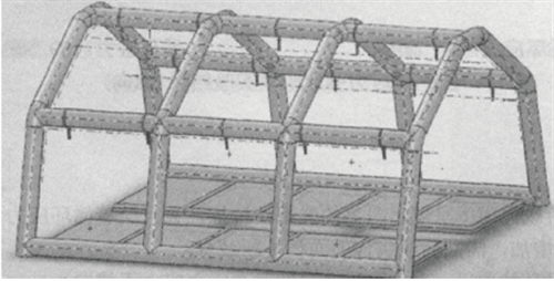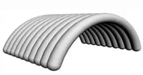 氣肋式膜結(jié)構(gòu)是一種采用高壓氣肋作為支承體系的充氣膜結(jié)構(gòu),通過將多根氣肋連接成整體的方式創(chuàng)造出使用空間,具有輕質(zhì)便攜、可快速運輸、低耗能、安全可靠等優(yōu)點。