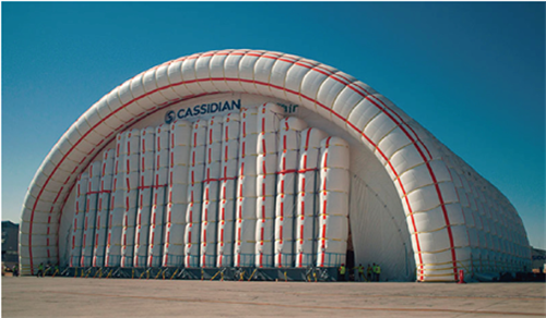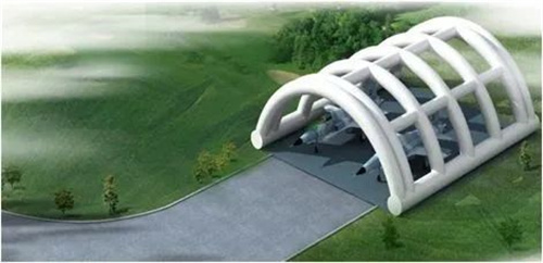 HangarH54Getafe充氣機庫)于2013年6月建造完成,工期為6個月。其凈寬為54m,凈長為110m,凈高為23m,管徑約為5m,實用面積為6000m2,允許容納2架大型飛機(如空客A310、空客A400M、波音707等)。從電腦或智能手機可以實時訪問壓力、風(fēng)速、電機功率、能源消耗等相關(guān)參數(shù)。結(jié)構(gòu)設(shè)計時,使用脊帶加強每根氣肋的剛度,從而顯著降低了膜面應(yīng)力,使用肋帶、箍帶、豎向帶和交叉帶連接多根氣肋,從而實現(xiàn)了跨度大、承載性能高的目標(biāo)。機庫前門采用可移動的充氣圓柱組合而成。