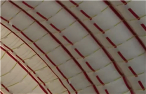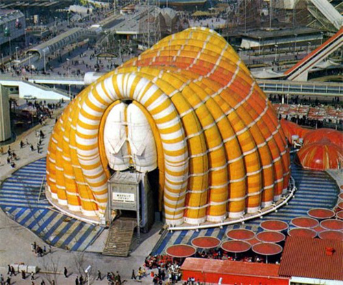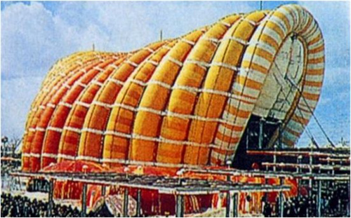 富士館采用氣肋式膜結(jié)構(gòu),結(jié)構(gòu)跨度50m。該館由16根直徑4m、長78m的拱形氣肋圍成,氣肋間每隔4m用寬500mm的水平系帶把他們環(huán)箍在一起。呈半圓拱形,最高點向外突出7m。