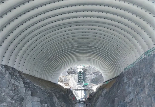 本項目膜結(jié)構(gòu)由56m×102m×24m的大跨度氣肋組成,總建筑面積達(dá)5700㎡,該結(jié)構(gòu)安裝拆卸方便,重復(fù)利用率高,實現(xiàn)了材料科學(xué)、智能控制與結(jié)構(gòu)工程的深度融合。氣肋式膜結(jié)構(gòu)底部基礎(chǔ)采用預(yù)制、模塊化結(jié)構(gòu)搭建,大跨度智能氣肋固定于自研的可移動軌道平臺上,通過移動平臺電機驅(qū)動,以實現(xiàn)在施工作業(yè)面來回移動,可有效解決高海拔地區(qū)瀝青混凝土心墻施工防風(fēng)、防雨及冬季保溫難題,有利于加快工程建設(shè)進(jìn)度,提高工程質(zhì)量,為西藏帕孜水利工程大壩瀝青混泥土心墻填筑按下“加速”鍵。