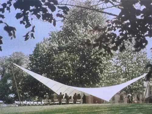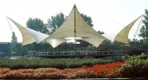 奧托1955年設(shè)計(jì)卡塞爾聯(lián)邦花園展覽音樂(lè)廳像是一個(gè)四點(diǎn)支撐的帳篷依靠邊索給膜施加預(yù)應(yīng)力使帳篷的外形呈現(xiàn)兩頭向上、兩頭向下的形狀(馬鞍形)這個(gè)設(shè)計(jì)宣告了帳篷設(shè)計(jì)進(jìn)入了全新的時(shí)代。