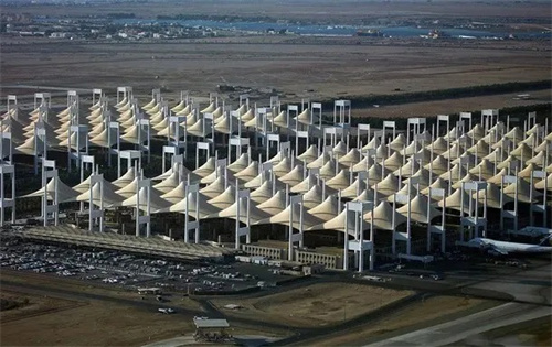沙特吉達(dá)國(guó)際機(jī)場(chǎng)的Hajj航站樓(朝覲航站樓)是全球穆斯林朝覲者前往麥加的重要交通樞紐,航站樓采用獨(dú)特的膜結(jié)構(gòu)帳篷屋頂,由特氟隆涂層玻璃纖維織物制成,可反射76%的太陽(yáng)輻射,即使在高溫環(huán)境下也能保持室內(nèi)涼爽。是世界上最早也是最大的張拉膜結(jié)構(gòu)之一。由210頂巨大的錐形膜結(jié)構(gòu)單元組成,猶如一群沙漠中的帳篷,既體現(xiàn)了當(dāng)?shù)匚幕瘋鹘y(tǒng),又完美解決了大跨度遮陽(yáng)問(wèn)題。