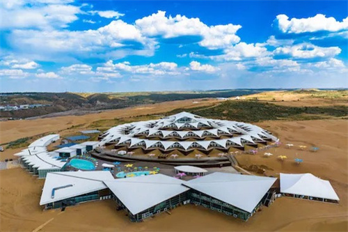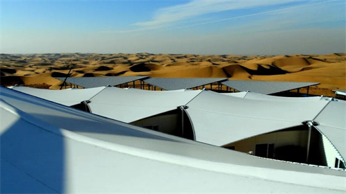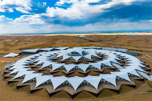 膜結(jié)構(gòu)以“蓮花”為靈感,通過(guò)層層張拉膜模擬蓮花的形態(tài),既呼應(yīng)沙漠中沙丘的曲線,又形成獨(dú)特的視覺(jué)景觀。這種設(shè)計(jì)不僅美觀,還充分考慮了沙漠環(huán)境中的日照、風(fēng)沙等因素,實(shí)現(xiàn)了功能與形式的統(tǒng)一。采用輕鋼結(jié)構(gòu)作為支撐,搭配高強(qiáng)度膜材,既減輕了建筑自重,又通過(guò)特定的鋼板固定流沙,形成類似“沙海浮舟”的獨(dú)特地基基礎(chǔ),確保在沙漠環(huán)境中保持穩(wěn)定。