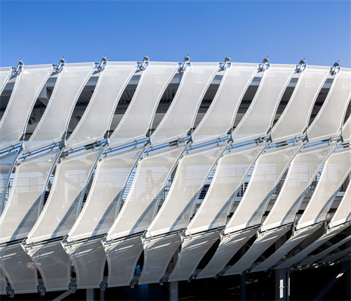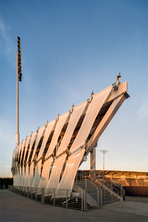 PTFE材料的半透明特性,創(chuàng)造出獨(dú)特的視覺(jué)對(duì)話(huà)。場(chǎng)外的人可以瞥見(jiàn)場(chǎng)內(nèi)活動(dòng)的模糊光影,激發(fā)了好奇心與參與感;場(chǎng)內(nèi)觀(guān)眾則能透過(guò)表皮看到公園的綠意,緩解了大型建筑的封閉感。