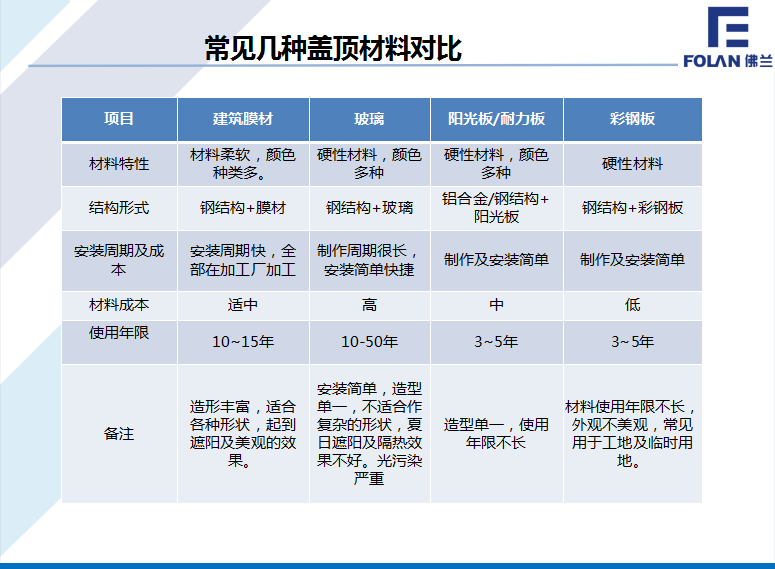 常見屋頂覆蓋材料,通過下表進(jìn)行對比??梢?,膜結(jié)構(gòu)的性價比好。