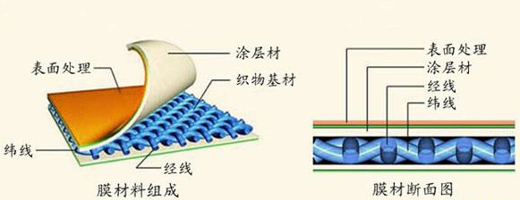 基布一般由高強(qiáng)度聚酯纖維(PVC類膜材)或玻璃纖維(玻璃纖維類膜材)編織而成。