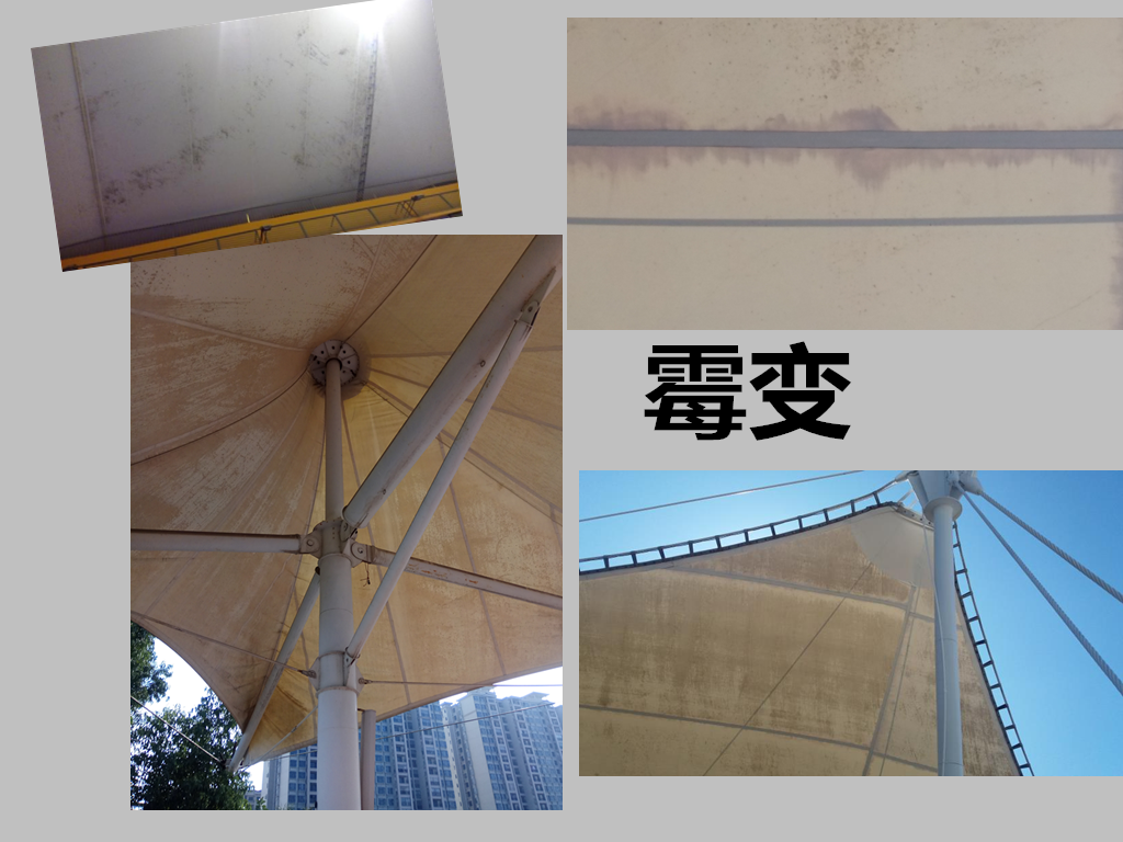 一些劣質(zhì)的膜材,往往通過少涂或者不涂自潔涂層,或涂刷其他材料(如清漆)等來降低生產(chǎn)成本,以達(dá)到低價競爭的目的。而客戶又很難通過肉眼去分辨膜材表面涂層是否被造假。一般,完工后1年左右,使用劣質(zhì)膜材的工程會出現(xiàn)膜體松動、徐變,膜材出現(xiàn)霉斑、黑點(diǎn)、更有甚者會出現(xiàn)表涂層剝離脫落。3年后,霉斑連成片,膜基布里的絲霉斷,強(qiáng)度減弱,遇大風(fēng)一吹,形成破洞、裂縫,最終破損報廢。