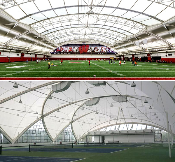 ⑦自潔性。膜材的表面涂層、特別是其中的聚四氟乙烯(PTFE)涂層,具有良好的非粘著性,大氣中的灰塵及臟物不易附著與滲透,而且其表面的灰塵被雨水沖刷干凈,常年使用后仍能保持外觀的潔凈及室內的美觀。