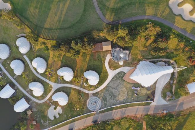 該度假酒店俯瞰過去形如露出地面的巨大卵石,較大的公共露天空間與較小的私密空間在相交的拱頂下獲得連接。入口迎賓處,酒吧,餐廳和圖書閱覽室彼此相連,如同場地中的天然景觀,一簇簇繭狀的張力膜結構如同豹爪一般印刻在場地中,而位于其下的水池,則吸引了無數野生動物前來光顧。
