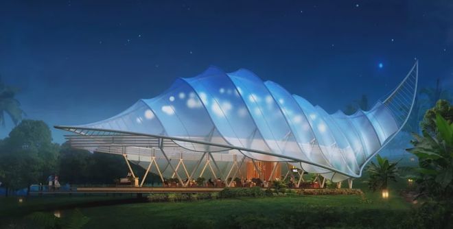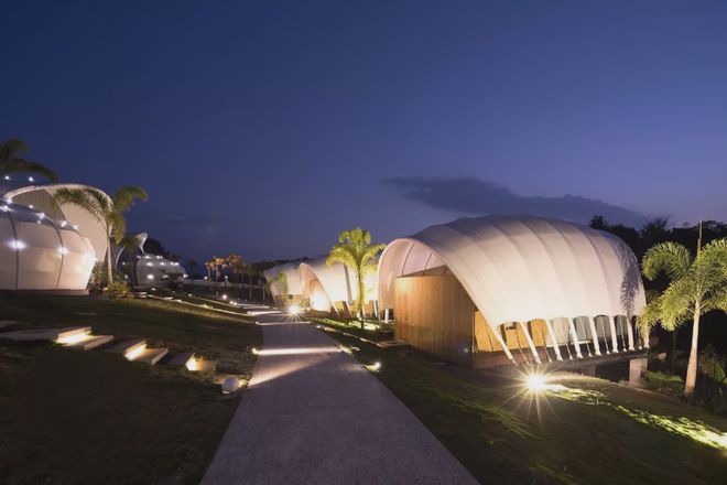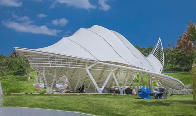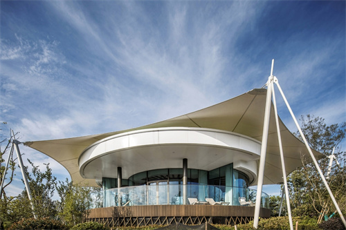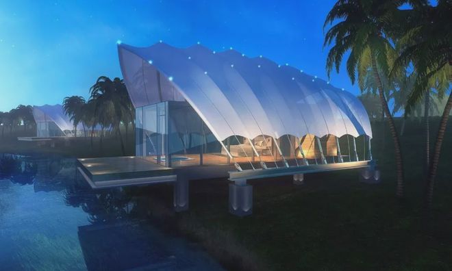 可見澤棲帳篷酒店,所有建筑都采用了張拉膜結構,完美地體現了建筑的獨特意象。
