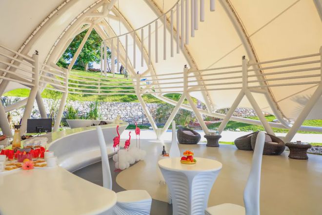 設計首創(chuàng)仿生帳篷建筑語匯,造型上融入多種仿生小動物設計,在如此靈動童話般的環(huán)境空間中,客人的身體也仿佛幻化為,比蝶更輕盈,比蜂更自由的靈性存在。