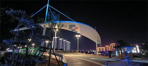 完工后的喇叭花膜結(jié)構(gòu)大門,在藍天白云的映襯下,格外引人注目。最值得一提的是其夜景,膜結(jié)構(gòu)大門自成投影天幕,獨樹一幟,各種圖案,夢幻多彩。