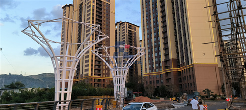 為提升小區(qū)時尚美觀性及豐富小配套服務(wù),業(yè)主方在小區(qū)興建了兩處膜結(jié)構(gòu)大門,其中一處呈拱型,簡約大氣。另一處呈喇叭花型,四朵喇叭花拽拉著兩個吊帽,造型獨特。