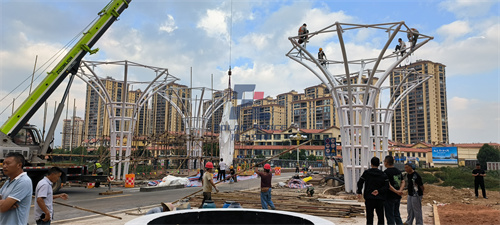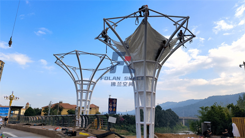 喇叭花鋼構(gòu)呈白色,頂部用鋼球連接,美觀堅固。在膜安裝過程中,佛蘭項目施工人員先要戴好安全帽,綁好安全繩,蹲在喇叭花型鋼構(gòu)的幾個端點,等吊機把膜吊裝到喇叭花鋼構(gòu)內(nèi),工人們就齊心協(xié)力,通力合作,慢慢把膜材展開,張拉及固定。