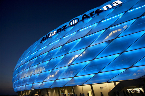 安聯(lián)球場的設(shè)計非?,F(xiàn)代化,外立面的LED燈可以根據(jù)比賽情況變換顏色,極具視覺沖擊力。當拜仁慕尼黑隊主場比賽時,體育場會變成紅色;當慕尼黑1860隊主場比賽時,體育場會變成藍色;世界杯比賽中,德國國家隊在這里比賽時,體育場則會變成白色。